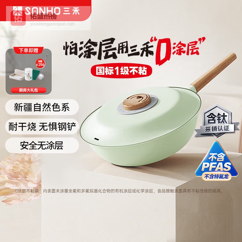 【品牌直营】三禾0涂层不含PFAS不粘煎炒锅家用炒菜锅无涂层燃气灶电磁炉通用晨雾绿30cm30cm¥