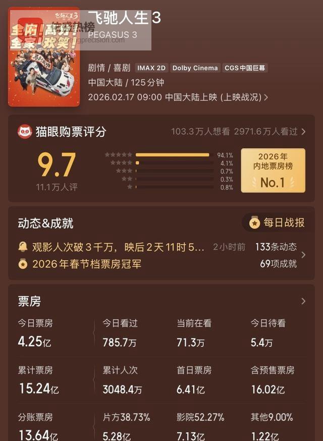 而《镖人》这种硬核武侠,改编自顶级国漫,口碑坚挺,但它的受众是更垂直的年轻男性和原作粉。在春节档这个追求“合家欢”最大公约数的修罗场里,它天然就是“非主流”。院线连试错的机会都不会给它。结果就是,想看的观众找不到场次,被迫去看《飞3》或者干脆不看;而《飞3》的观众里,又有多少是“没得选”才去的?这构成了一个完美的数据闭环,看起来一切合理,实则扭曲至极。