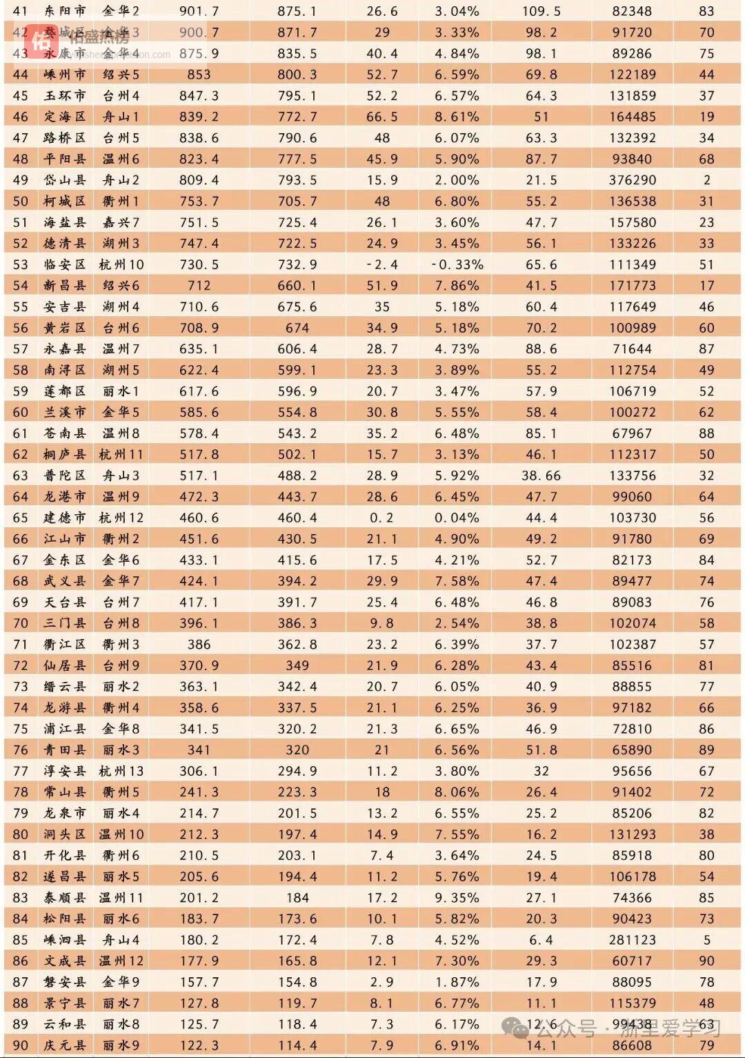 21、台州市温岭市1468.5亿元,22、绍兴市上虞区1464亿元,23、嘉兴市海宁市1438.4亿元,24、嘉兴市桐乡市1401.6亿元,25、湖州市吴兴区1374亿元,26、杭州市临平区1216.3亿元,27、嘉兴市平湖市1128亿元,28、嘉兴市南湖区1127亿元,29、宁波市奉化区1105.2亿元,30、宁波市宁海县1100.4亿元,31、温州市龙湾区1061.2亿元,32、温州市瓯海区1037.6亿元,33、杭州市富阳区1034.1亿元,34、宁波市江北区1028.2亿元,35、台州市临海市1018.3亿元,36、嘉兴市秀洲区1004.8亿元,37、宁波市象山县1004.2亿元,38、湖州市长兴县1000.9亿元,39、嘉兴市嘉善县1000.1亿元。