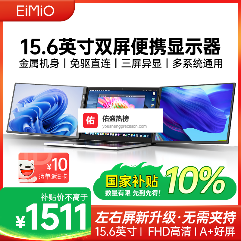 【京东自营】Eimio可折叠双屏便携显示器扩展三屏笔记本副屏电脑扩展屏幕15.6英寸办公炒股游戏扩展¥