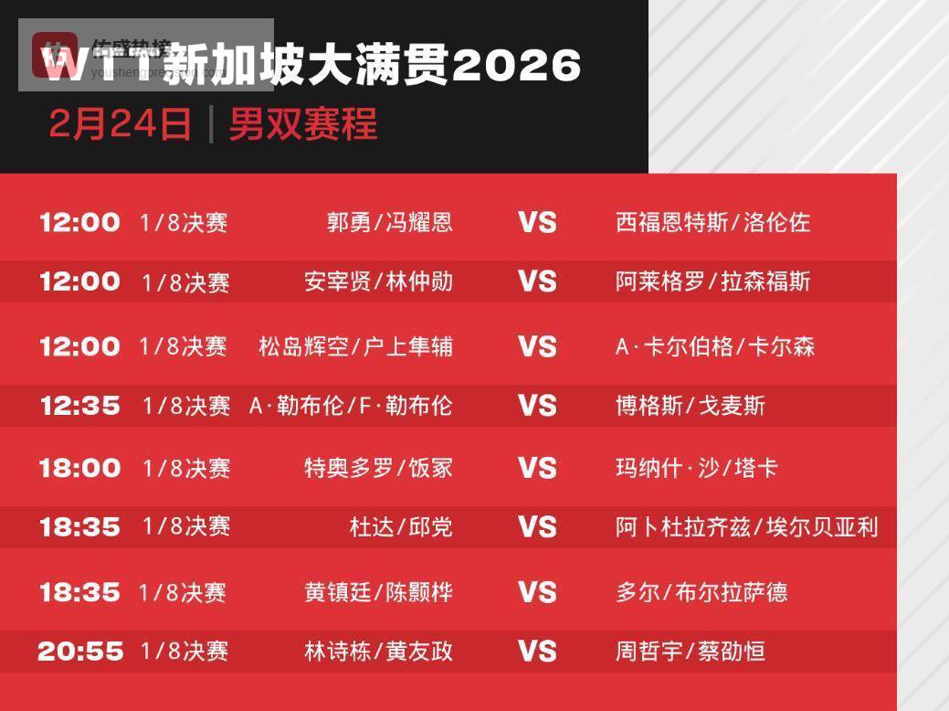 晚上8点55分,今日国乒的最后一战。 男双1/8决赛,林诗栋再次登场,这次他的身边是发小兼老搭档黄友政。 他们的对手是新加坡本土组合周哲宇和蔡劭恒。 林诗栋和黄友政配合默契,今年初曾在马斯喀特站夺冠,是国乒在男双项目上的重点培养对象。 这场比赛,不仅是对林诗栋一日双赛体能的终极考验,更是国乒为洛杉矶奥运会双打项目布局的重要一环。 面对实力有限的东道主组合,他们的目标只有一个:干净利落地横扫晋级,为今天的征程画上一个圆满的句号。