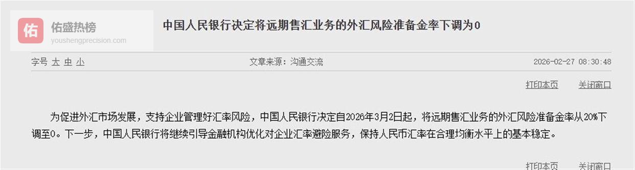 央妈突然出手,把一项关键的外汇“刹车”工具直接归零了。 2月27号,央行宣布从3月2号开始,远期售汇业务的外汇风险准备金率从20%一口气降到0。