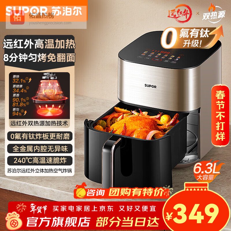 苏泊尔(SUPOR)空气炸锅有钛远红外双热源不翻面家用烤炸一体触控烤箱高清可视窗口6.3L大容量全金属内腔大幅降噪 KD60Y883 6.3L¥