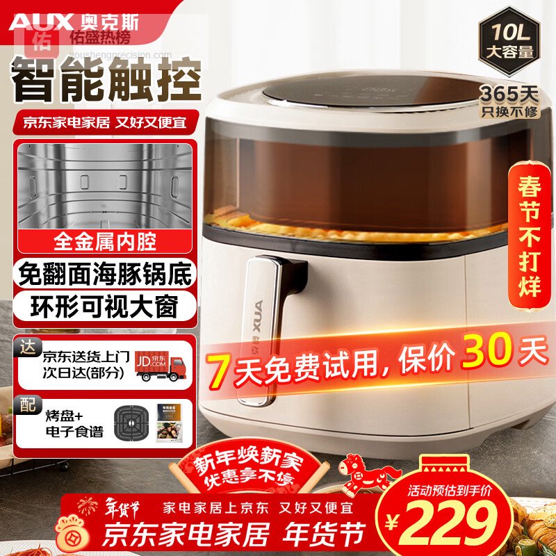 奥克斯炎烤空气炸锅免翻面可视家用大容量10L【金属腔体】智能菜单不沾易洗低脂蒸汽嫩烤炸锅烤箱¥