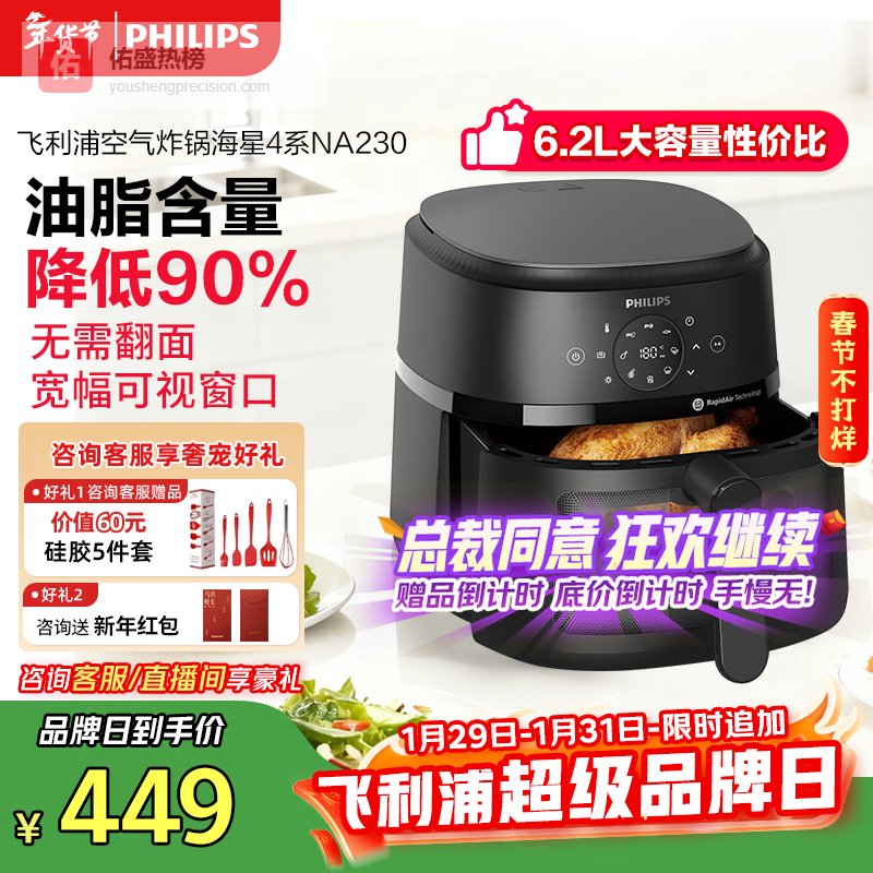 飞利浦(PHILIPS)海星底免翻面多功能空气炸锅家用可视窗口6.2L大容量炸烤箱一体 NA230 年货节送礼¥