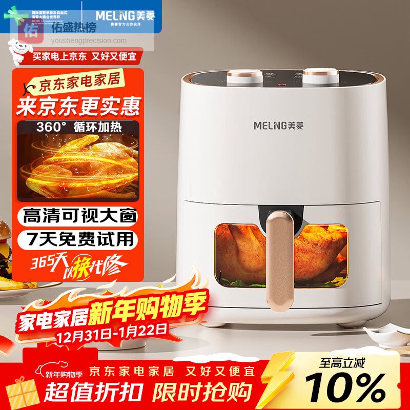 美菱(MeiLing)空气炸锅家用大容量 可视 不用翻面 大功率 全自动智能多功能电炸锅 无油低脂煎炸 【可视免翻面】双旋钮椰奶白金 6L¥