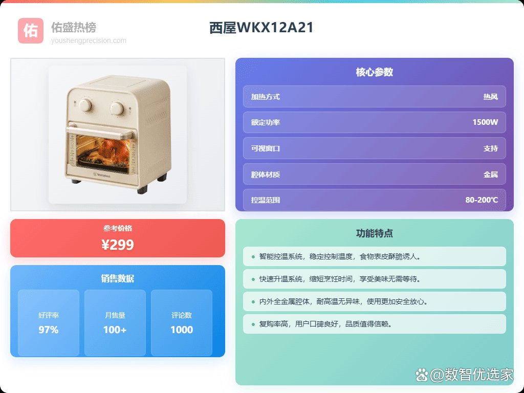 2️⃣ 热风免预热:它采用热风循环技术,基本不用提前预热,直接放食材进去就能烤。这样一来,做饭变得更快更方便,早上想吃点快手菜,随时都能搞定,不用等待,节省不少时间。
