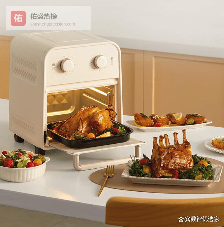 3️⃣ 大容量设计:5.3升的超大容量,一次可以同时烤多份,像全家聚餐或者招待朋友都绰绰有余。操作也很简单,双旋钮控温、定时,老人小孩都能轻松搞定,放在厨房里也很方便。