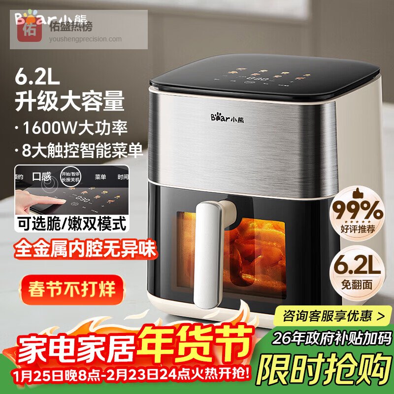 四、小熊1️⃣ 大容量6.2L:这个空气炸锅的容量挺大的,6.2升的空间可以一次烹饪3到7个人的份量,特别适合家庭聚会或者每天一家人吃饭。不用担心一次做不完,省事又方便。
