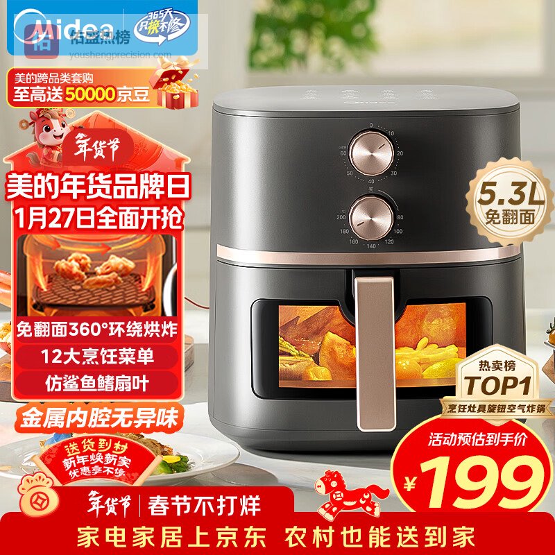 美的(Midea)可视空气炸锅免翻面家用多功能空气炸锅蒸烤一体实用旋钮大容量5.3L金属内腔热风循环KZE538J5¥