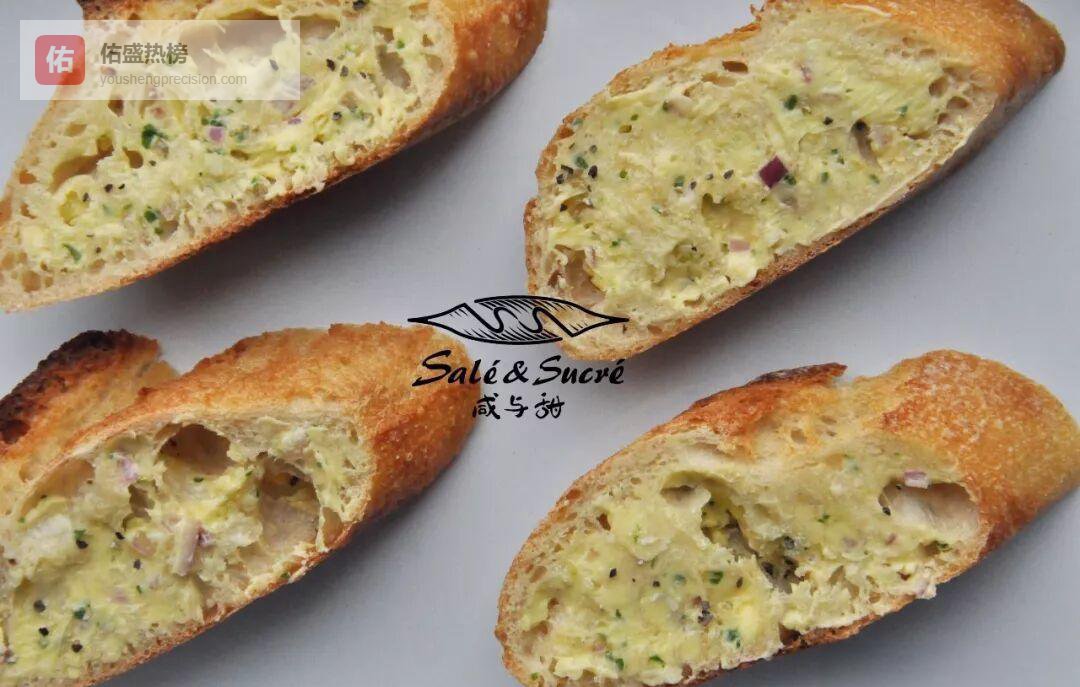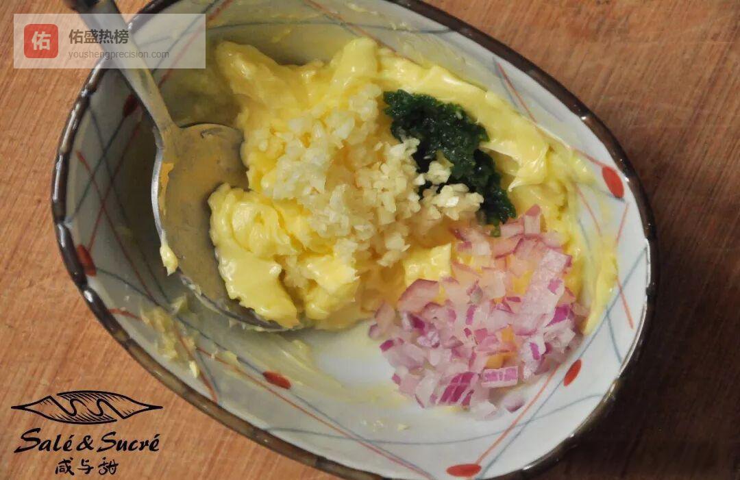 传统法棍斜切1 cm厚片,室温软化黄油里加入少许盐、蒜蓉、小葱碎、洋葱碎,搅成金黄蒜泥酱。