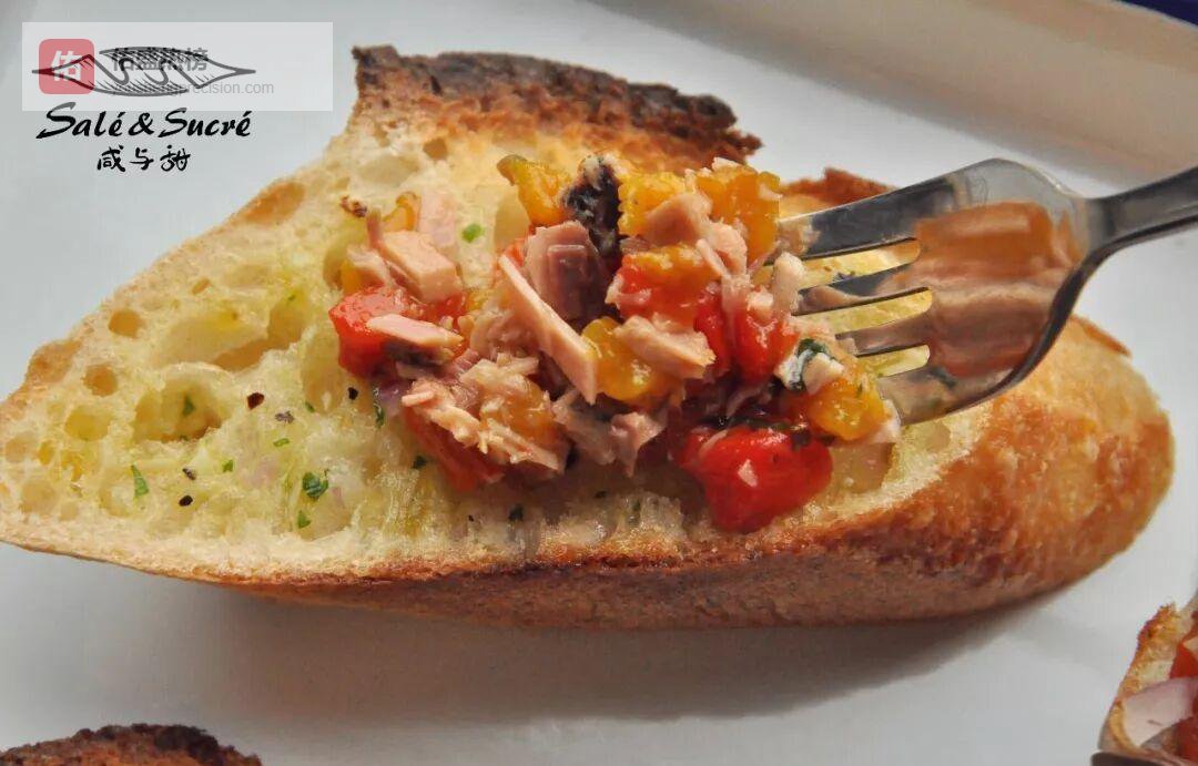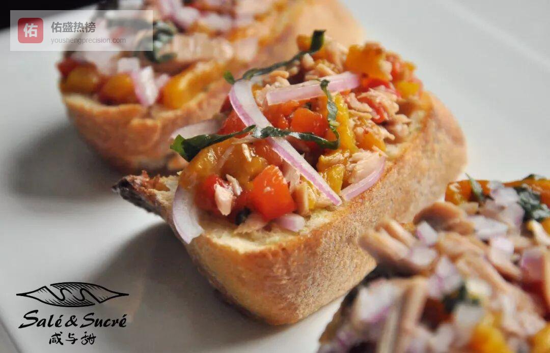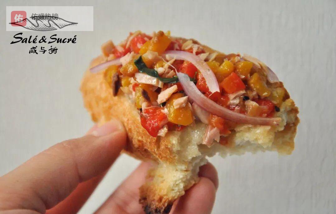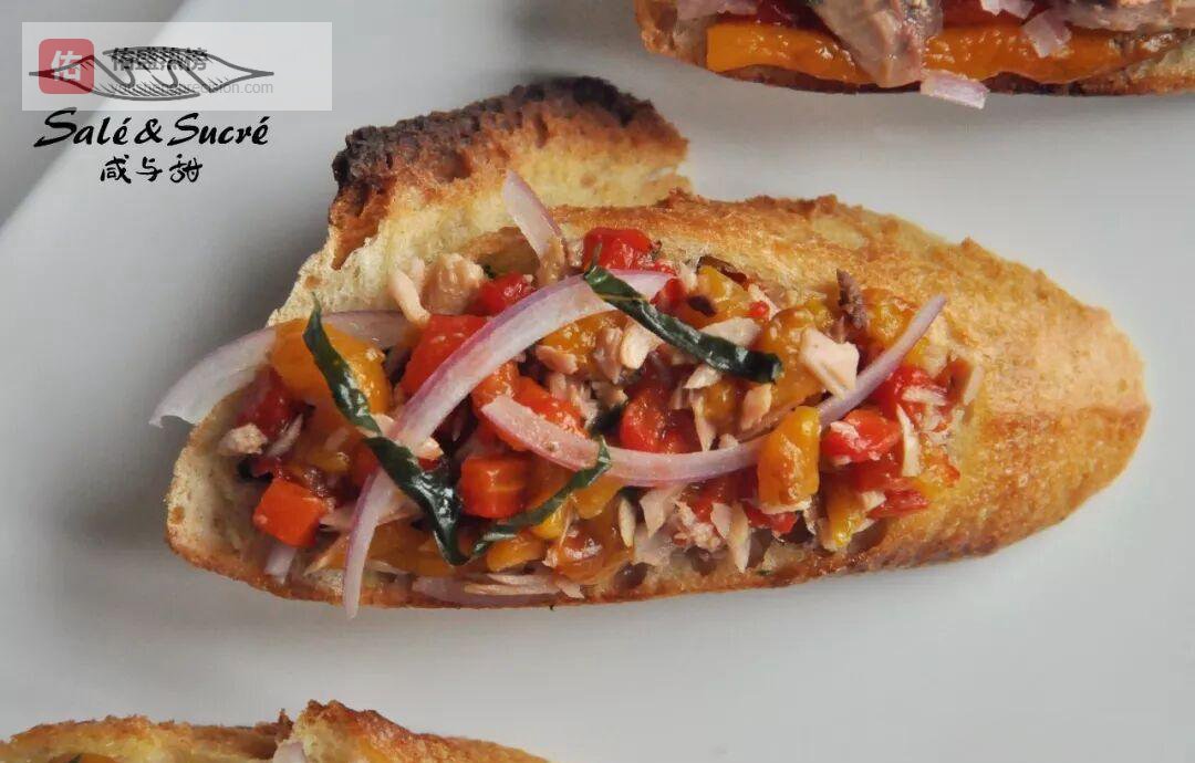 罐头鲔鱼沥干水分后撕成小朵,与腌好的甜椒条切丁混合;蒜香法棍片先铺一层鲔鱼,再压一层甜椒,最后点缀洋葱圈与罗勒叶——色彩像夏夜烟火。