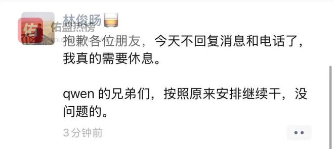 今天下午,他在朋友圈表示:抱歉各位朋友,今天不回复消息和电话了,我真的需要休息。qwen 的兄弟们,按照原来安排继续干,没问题的。