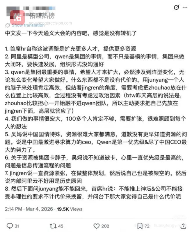 3、qwen是集团最重要的事情,希望人才来扩大,必然涉及到阵型变化,无论怎么变化希望大家做好。什么东西都不是没有代价的。用junyang一个人的脑子来处理肯定高效,但站着jingren的角度,需要考虑把zhouhao放在什么位置上比较高效,全过程没有考虑过政治因素(btw昨天高层的说法是,zhouhao比较担心一开始融不进qwen团队,所以主动要求把自己先放在jingren下面,高层就答应了)