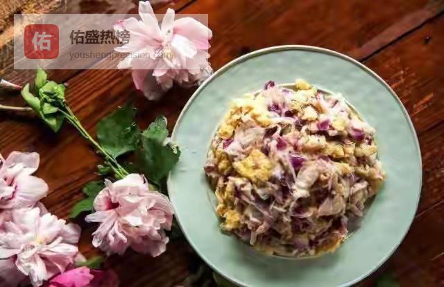 木槿花在绿化带很常见,开花量大,花朵也饱满。将未全开的花苞摘下洗净,裹蛋液翻炒或油炸,吃起来竟有类似鸡肉的香味,清新爽口。也有人用它做花酱,比玫瑰花酱更显清雅。