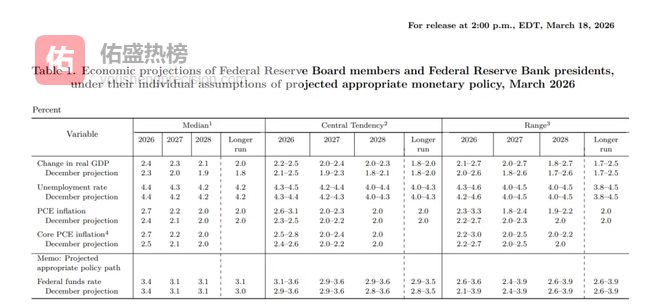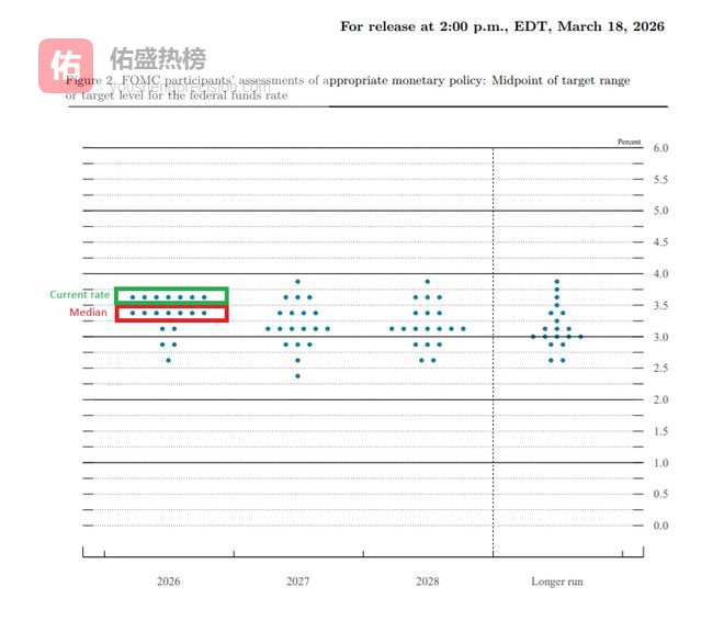 其次,就算全面上调增长与通胀预测,2026 年底 GDP 增速预期中值从 2.3% 上调至 2.4%,2026 年底核心 PCE 通胀预期中值从 2.5% 大幅上调至 2.7%,直接承认了通胀粘性超预期的现实,也意味着通胀回落至 2% 目标的周期将进一步拉长。