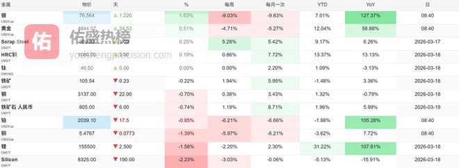 (2)大宗商品:原油与贵金属极端分化。布伦特原油大涨 5.7% 报 105.06 美元 / 桶,WTI 原油日内涨幅扩大至 3%、报 98.39 美元 / 桶。COMEX 黄金期货跌 3.68% 报 4823.90 美元 / 盎司,COMEX 白银期货跌 5.63% 报 75.42 美元 / 盎司,双双大幅下挫。伦敦基本金属亦多数下跌,但LME期铝涨0.59%报3419.5美元/吨。