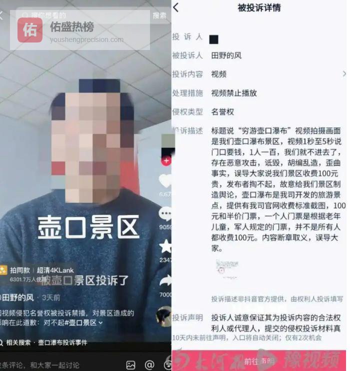 “门口要钱,一人100,我们就不进去了。”据大河报报道,近日,有网友发布了一段在壶口瀑布景区外拍摄的视频,定位显示黄河壶口瀑布风景名胜区。原本只是略显心酸的“穷游”记录,却没想到被壶口瀑布景区投诉侵犯名誉权。