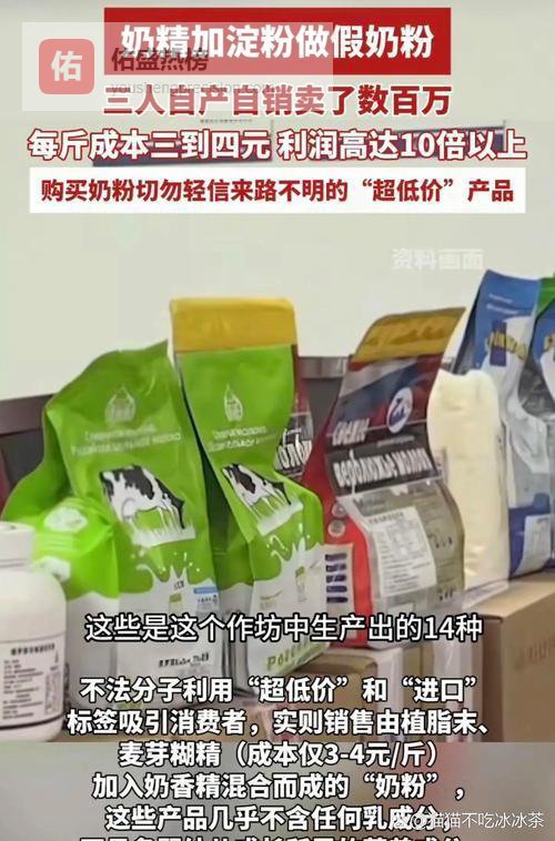 说出来大家可能都不信,他们做假奶粉的原料特别简单,就是平时咱们知道的奶精、淀粉类的东西,再加上一些廉价的固体饮料,然后放点儿工业香精,调一调味道和质地,就能做得跟真奶粉差不多。