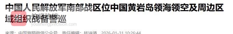 1. 南部战区官方通报:2024年1月31日,发布黄岩岛海空域战备警巡信息。