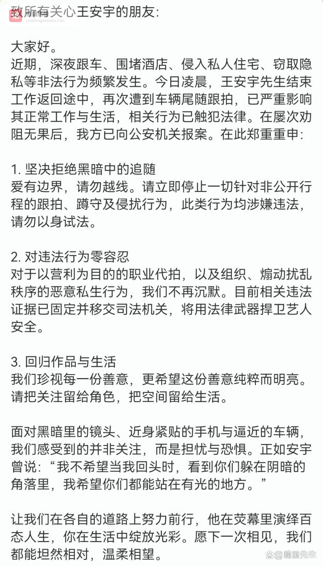 面对无休止的侵扰,王安宇工作室不仅报案,更发出三点明确态度:坚决拒绝黑暗中的追随、对违法行为零容忍、呼吁回归作品与生活。