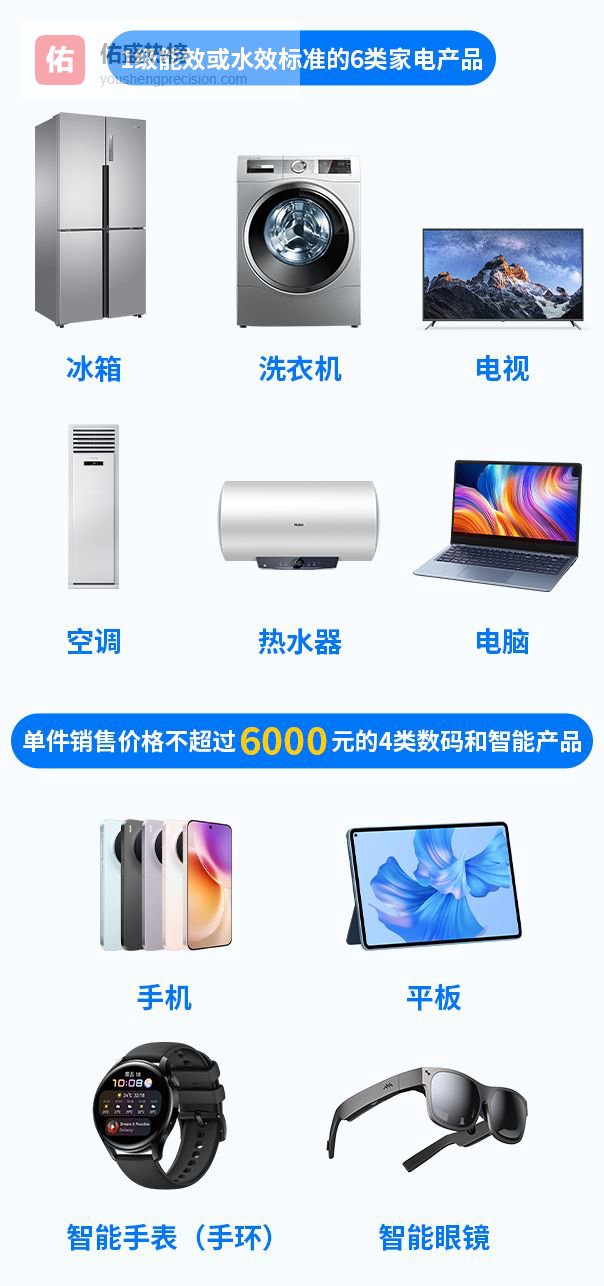 我市按照全国、全省统一的品类和标准,对个人消费者购买1级能效或水效标准的冰箱、洗衣机、电视、空调、热水器、电脑6类家电产品,以及单件销售价格不超过6000元的手机、平板、智能手表(手环)、智能眼镜4类数码和智能产品给予补贴。