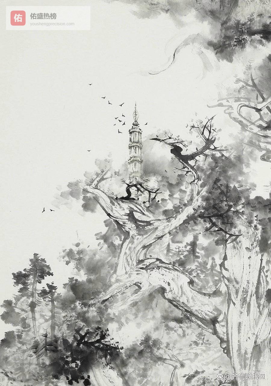 画家没有局限于单一景点的描摹,而是采用全景式构图,将群峰叠嶂作为背景,辟支塔挺拔于画面中央,千佛殿的飞檐、墓塔林的错落、山间的流泉与古木,都在笔墨间层次分明。他以苍劲的笔触勾勒山石与古建的筋骨,用温润的墨色晕染山林的葱郁与云雾的缥缈,既保留了传统山水画的意境,又融入了对灵岩寺人文底蕴的深刻理解。