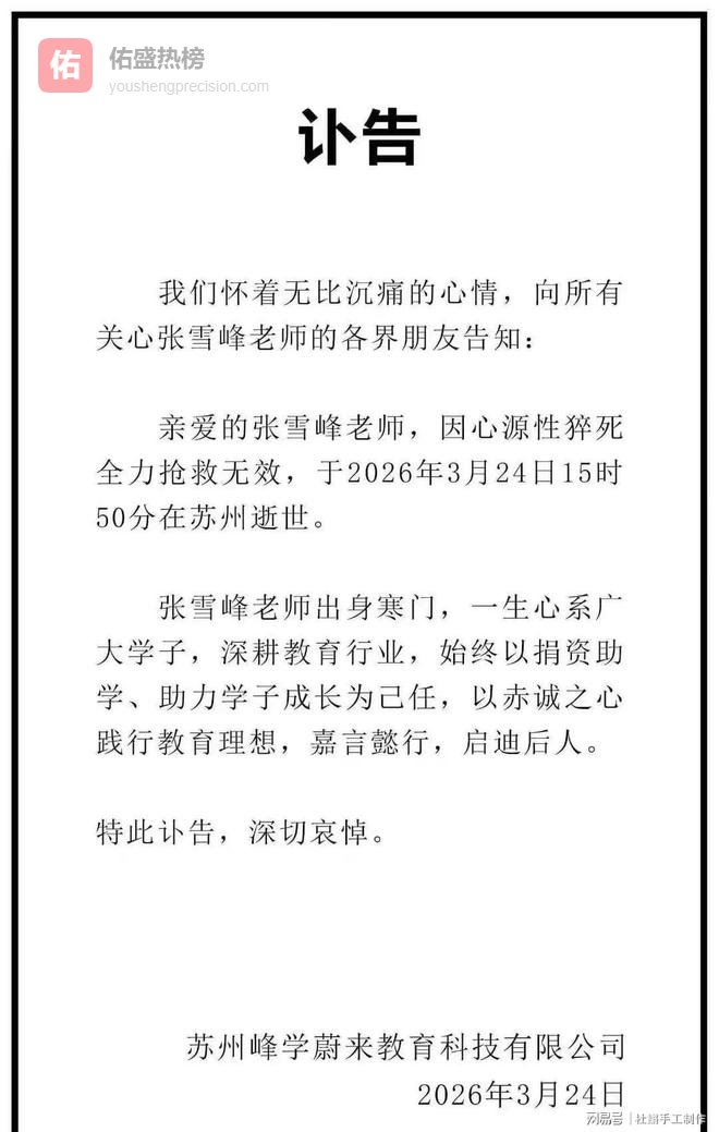 张雪峰离世,为200员工存半年工资,留女儿过亿资产