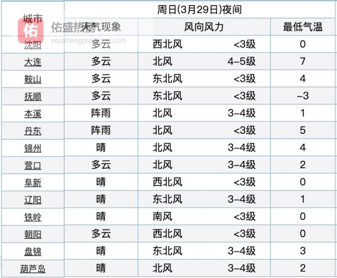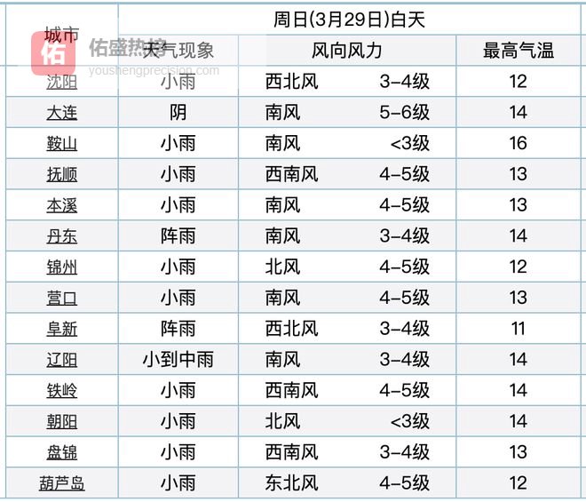 29日2时到20时,鞍山、抚顺北部、锦州东部、铁岭、盘锦地区有中雨并伴有雷电,其他地区有小雨,其中抚顺东部、本溪东部、丹东北部地区及岫岩的山区有雨夹雪;最低气温抚顺、丹东、铁岭、葫芦岛地区3℃到5℃,其他地区6℃到10℃。