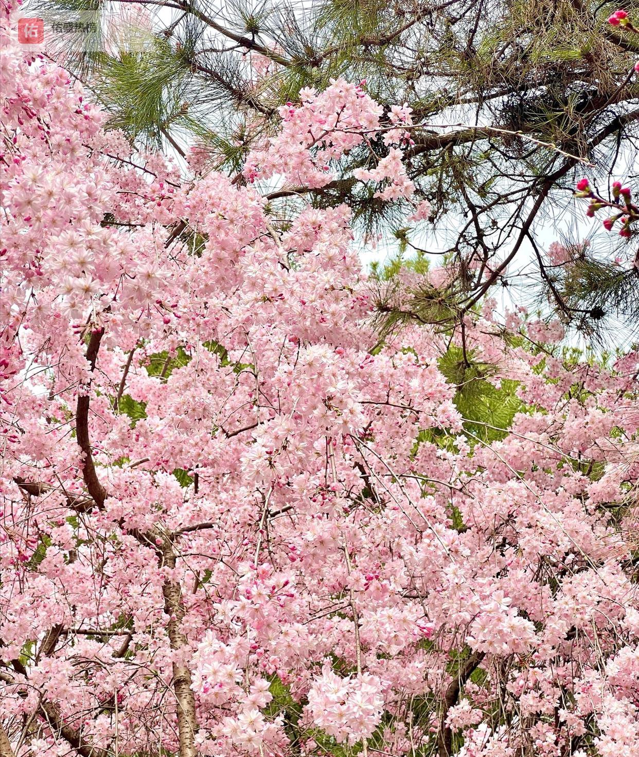 穿过检票口,眼睛瞬间被“饱和”。早樱与晚樱接力绽放,粉得轻盈、白得透亮,一树挨着一树,把整座院落染成一幅移动的水彩。我偏爱那几株垂枝樱——枝条低垂,花簇成串,风一过,像粉色瀑布倒挂,轻轻洒进凡间。