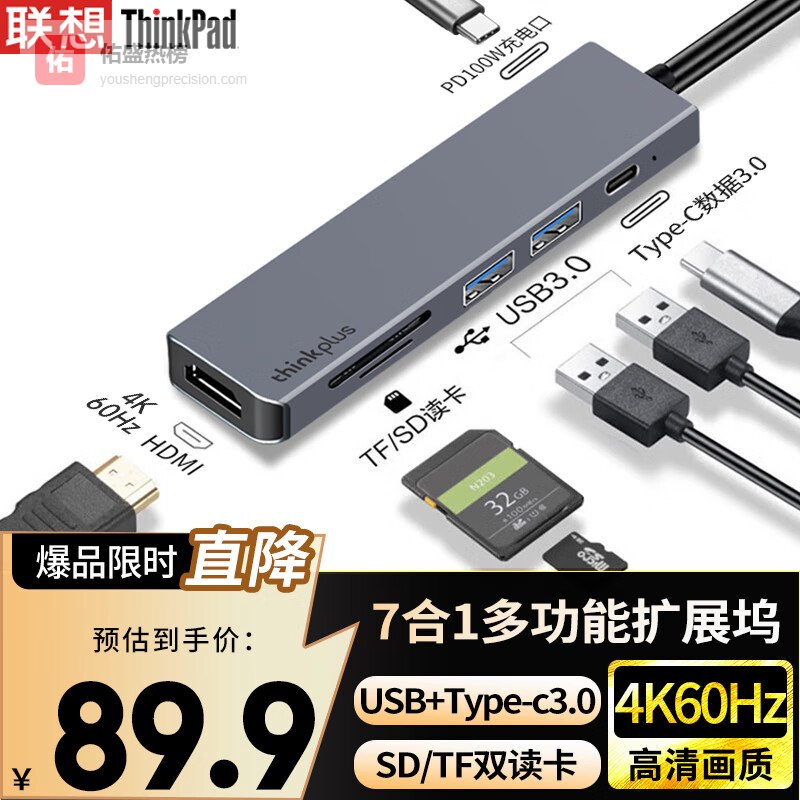 ThinkPad联想Type-C扩展坞USB分线器USB-C数据SD/TF读卡HDMI转接头4K60Hz笔记本拓展坞PD快充100W金属LC06¥