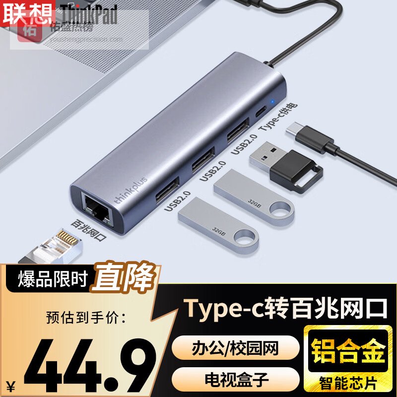 ThinkPad联想Type-C转网口转换器RJ45网口转接器USB-C扩展坞HUB分线器笔记本拓展坞延长线LRC3百兆¥