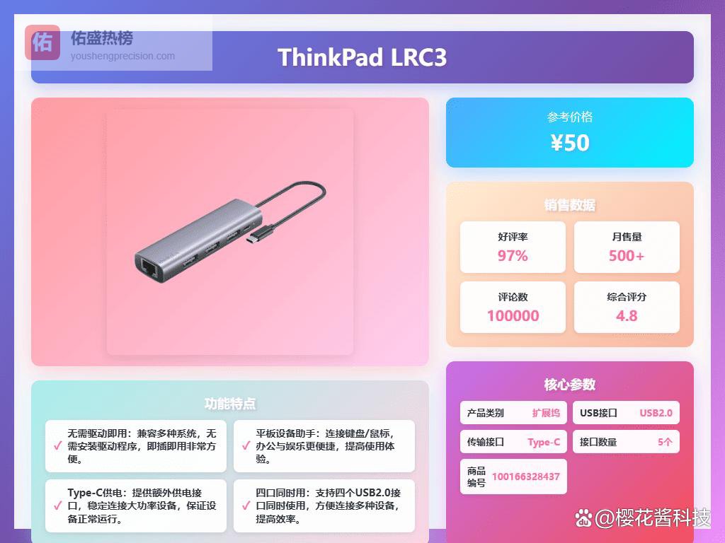 选择ThinkPad USB分线器,首先得看你的实际需求。你是接口不够用?还是需要更高的传输速度?或者两者都要?市面上的ThinkPad扩展坞五花八门,像LA04、LC10、LA04B这种,接口丰富,能满足日常办公需求,USB3.0接口的传输速度也够快。如果你经常要处理大文件,或者需要连接大容量硬盘,那就要特别关注传输速度和供电能力。像LC04这种,甚至能支持18TB的硬盘,还有独立的Type-C供电,用起来更安心。当然,接口的质量也很重要,毕竟谁也不想用几天就接触不良,所以尽量选择口碑好、做工扎实的型号。
