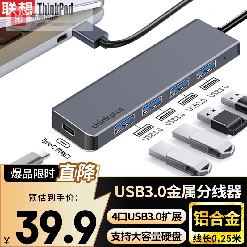 ThinkPad联想USB分线器3.0接口转接器HUB转换器笔记本扩展坞USB扩展延长线USB拓展坞LA04B 0.25M金属¥