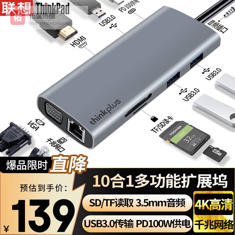 ThinkPad联想Type-C扩展坞USB-C转HDMI和VGA转接器USB分线器千兆网卡PD快充SD/TF读卡器笔记本拓展坞LC10¥