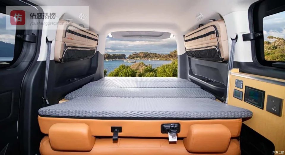 内饰是宿营核心亮点,原厂模块化设计一步到位,无需额外改装。二排座椅一键放倒,秒变1950mm×1470mm大床,搭配高密度海绵床垫,露营睡觉超舒服。床下全拓展置物平台、60L窗包、后开启储物柜,露营装备收纳无忧。轻旅版配房车专用铝塑地板、侧吧台,美途版升级E0级环保实木吧台柜、双层静音棉航空铝地板,质感与环保性拉满,隐藏式折叠桌,户外野餐、做饭超方便。