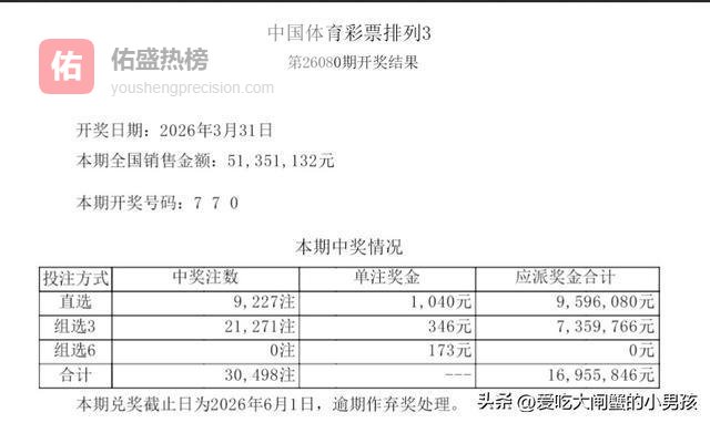 2026年3月31日,中国体育彩票排列3第26080期开奖,本期开奖号码为