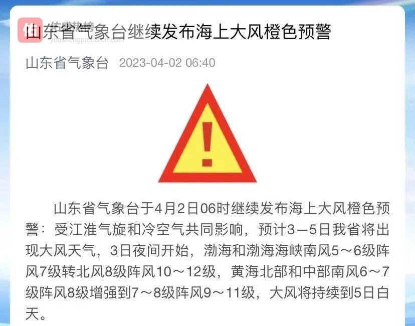 山东省气象台4月1日16时30分发布海上大风橙色预警和内陆大风黄色预警,同时提醒降雨、降温将“组团”来袭。预计3—5日,全省自南向北大风“上线”,江淮气旋与冷空气“联手”,带来过程降温6~8℃的断崖式体验。