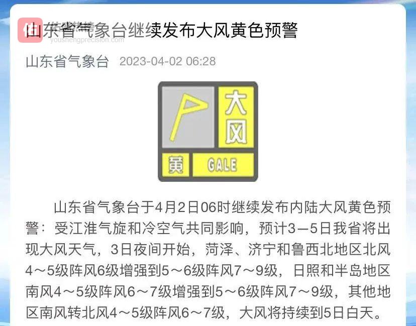 4日:菏泽、济宁、鲁西北、日照、半岛地区北风或南风均增强至5~6级阵风7~9级;其余地区南风转北风4~5级阵风6~7级。