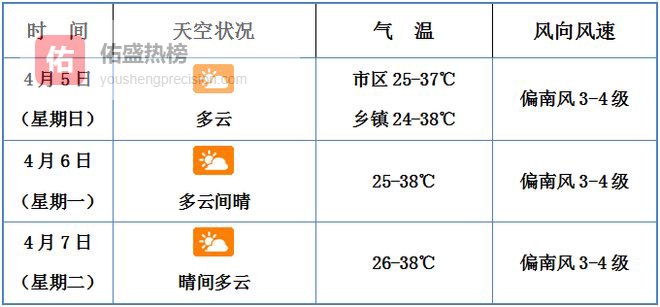 预计4月5日白天,海口、澄迈、临高、定安、屯昌、儋州、白沙、昌江和东方9个市县的大部分乡镇将出现37摄氏度以上的高温天气,请有关单位做好防暑降温、森林防灭火等相关工作。