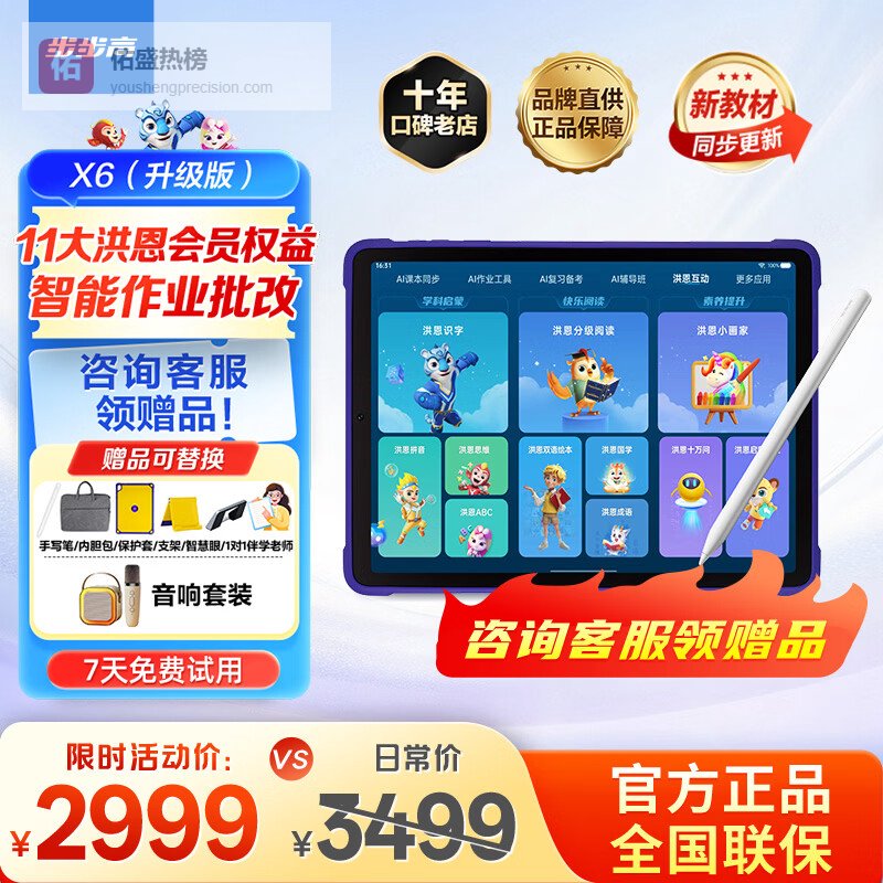 【品牌直营】步步高X6学习机赠送洪恩会员【11大洪恩APP】至尊AI学习机全年龄段学习平板电脑幼小衔¥