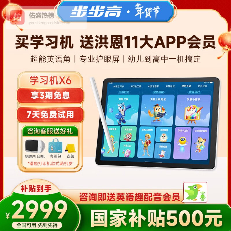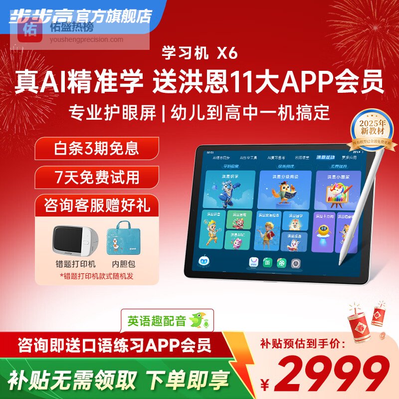 【京东自营】步步高X6学习机赠送洪恩会员【国家补贴500元】至尊AI学习机全年龄段学习平板电脑幼小衔¥