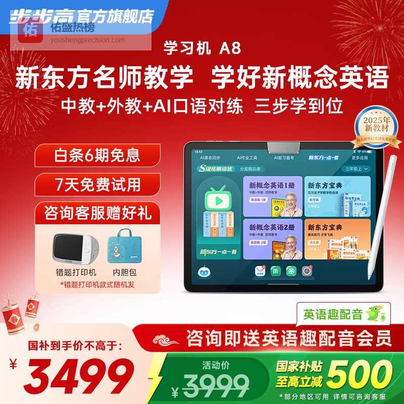 【品牌直营】步步高学习机A8新东方宝典课免费学英语小学初中高中学生平板电脑智能家教机护眼大屏学练机【¥