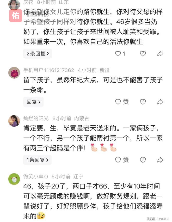 有网友评论,你希望你女儿走你的路你就生,你对待父母的样子希望孩子同样对待你你就生。46岁很多当奶奶了,你生孩子让孩子来世间被人耻笑和受罪。如果重来一次,你喜欢自己的活法你就生。