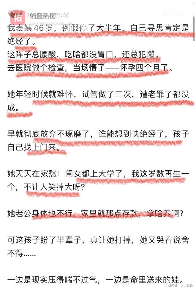 让人纠结啊!!一边是盼了半辈子的骨肉,是无数次失望后命运的补偿,即便历经艰辛,也终究舍不得亲手扼杀这份来之不易的生命;另一边却是冰冷的现实:女儿已上大学,自己年近半百,体力精力大不如前,丈夫身体欠佳,家庭经济条件有限,养育孩子的成本、精力消耗,以及旁人可能的议论,都像沉甸甸的石头,压得她喘不过气。