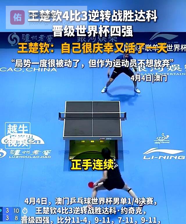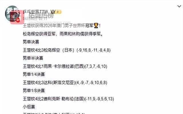 王楚钦这次夺冠堪称“地狱难度模式”。男队其他四人早早出局,他1/8决赛就被法国新星小勒布伦先拿一局,1/2决赛更被达科逼到1比3绝境。最惊险的是第五局2比5、6比9落后时,场边马龙手里的毛巾都快捏出水了。结果这小子硬是连扳三局上演大逆转,赛后采访还凡尔赛:“要是0比2落后可能就没了。”这表现直接把央视解说整破防了,当场盖章“25岁领军男乒”。