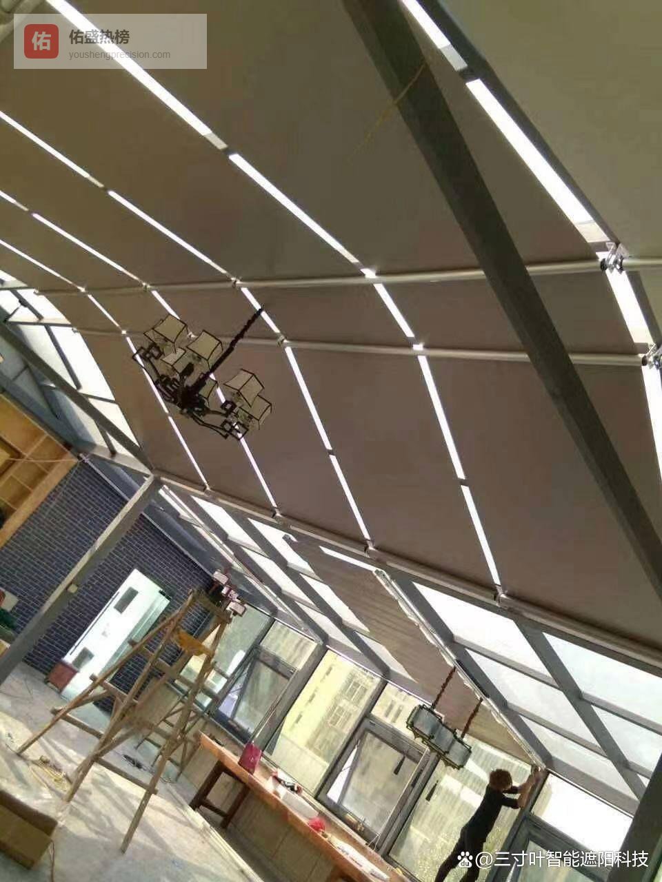评估一个折叠式天棚帘厂的技术能力,可以观察其如何处理异形空间。例如,对于弧形或菱形的玻璃顶,天棚帘的轨道需进行定制化弯曲,面料裁剪也需采用非矩形设计,这涉及复杂的几何计算与工艺实现。