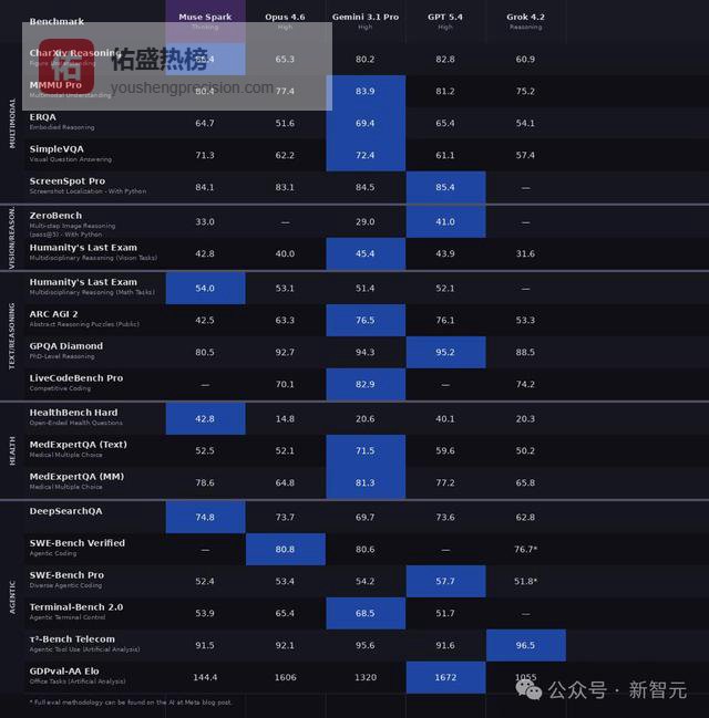 Meta把Muse Spark(Thinking模式)和Opus 4.6、Gemini 3.1 Pro、GPT 5.4、Grok 4.2放在一起比了个遍,覆盖多模态、文本思考、健康、Agent四个维度,总共20多个benchmark。