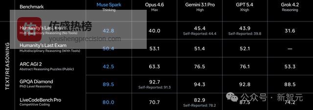Humanity's Last Exam(无工具),Muse Spark沉思模式拿了50.2,Gemini Deep Think 48.4,GPT 5.4 Pro 43.9。