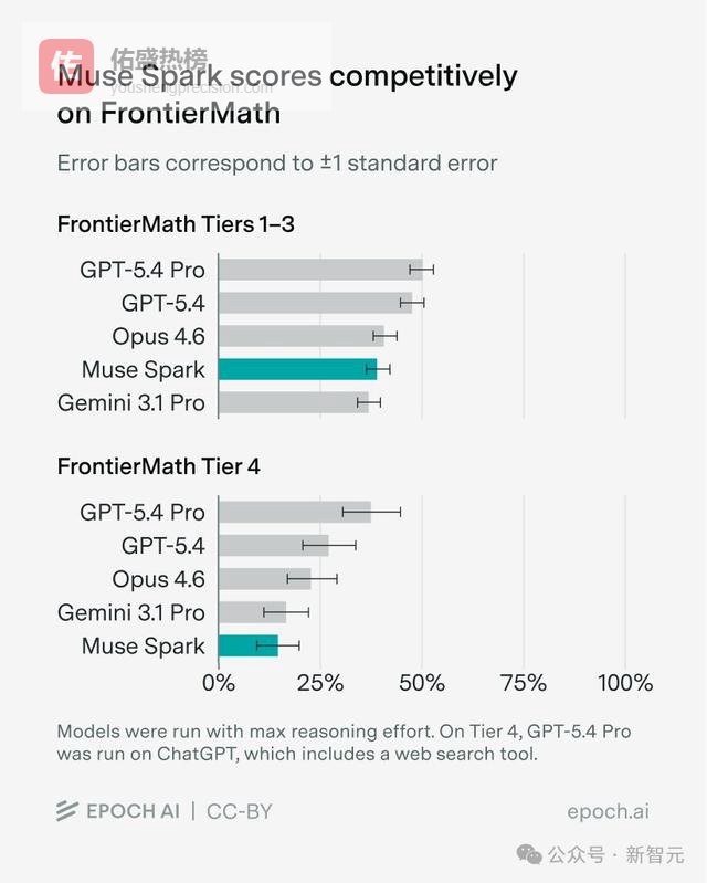 此外,在由数学大佬出题的FrontierMath上,Muse Spark在1-3层级上,直接碾压Gemini 3.1 Pro,不过在4层级却排在了倒数。